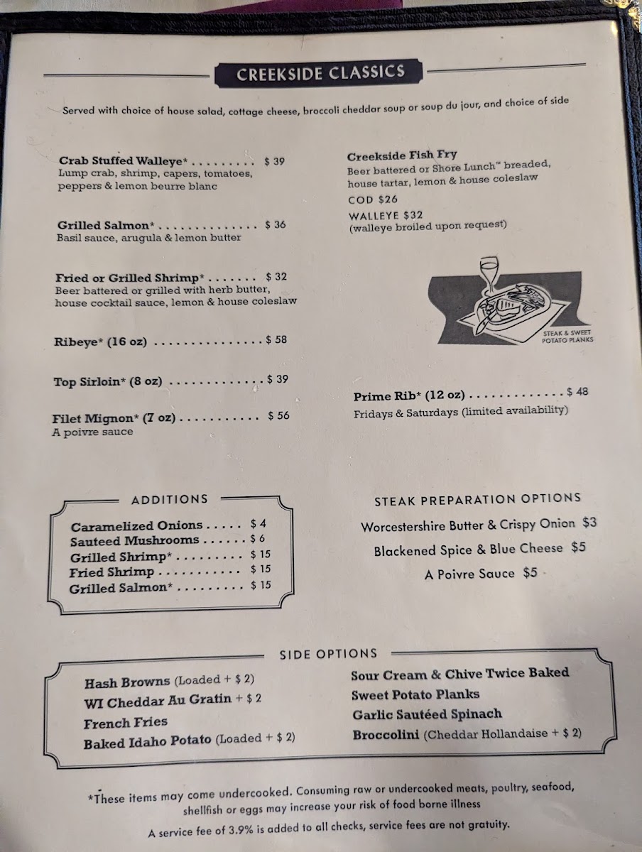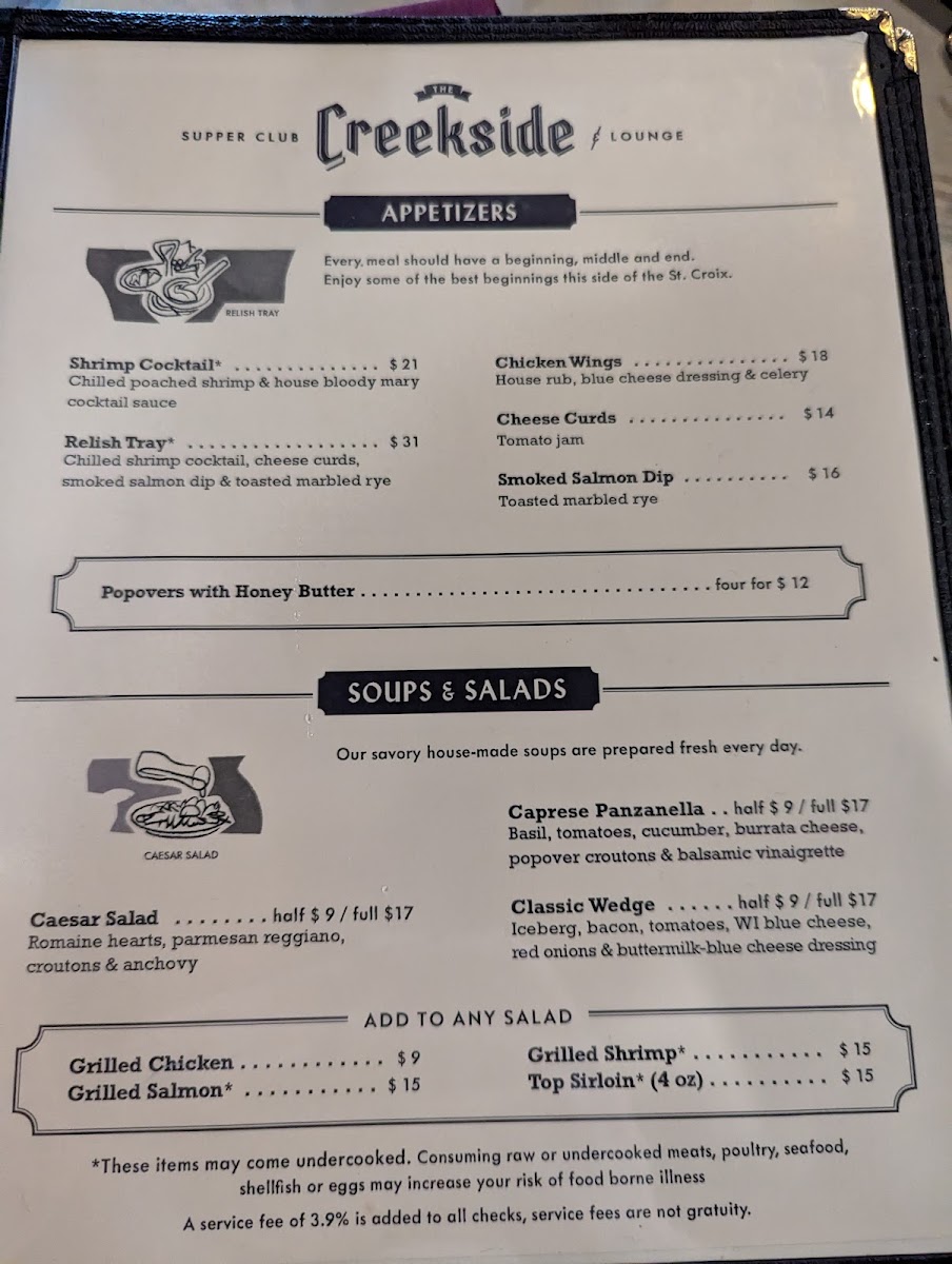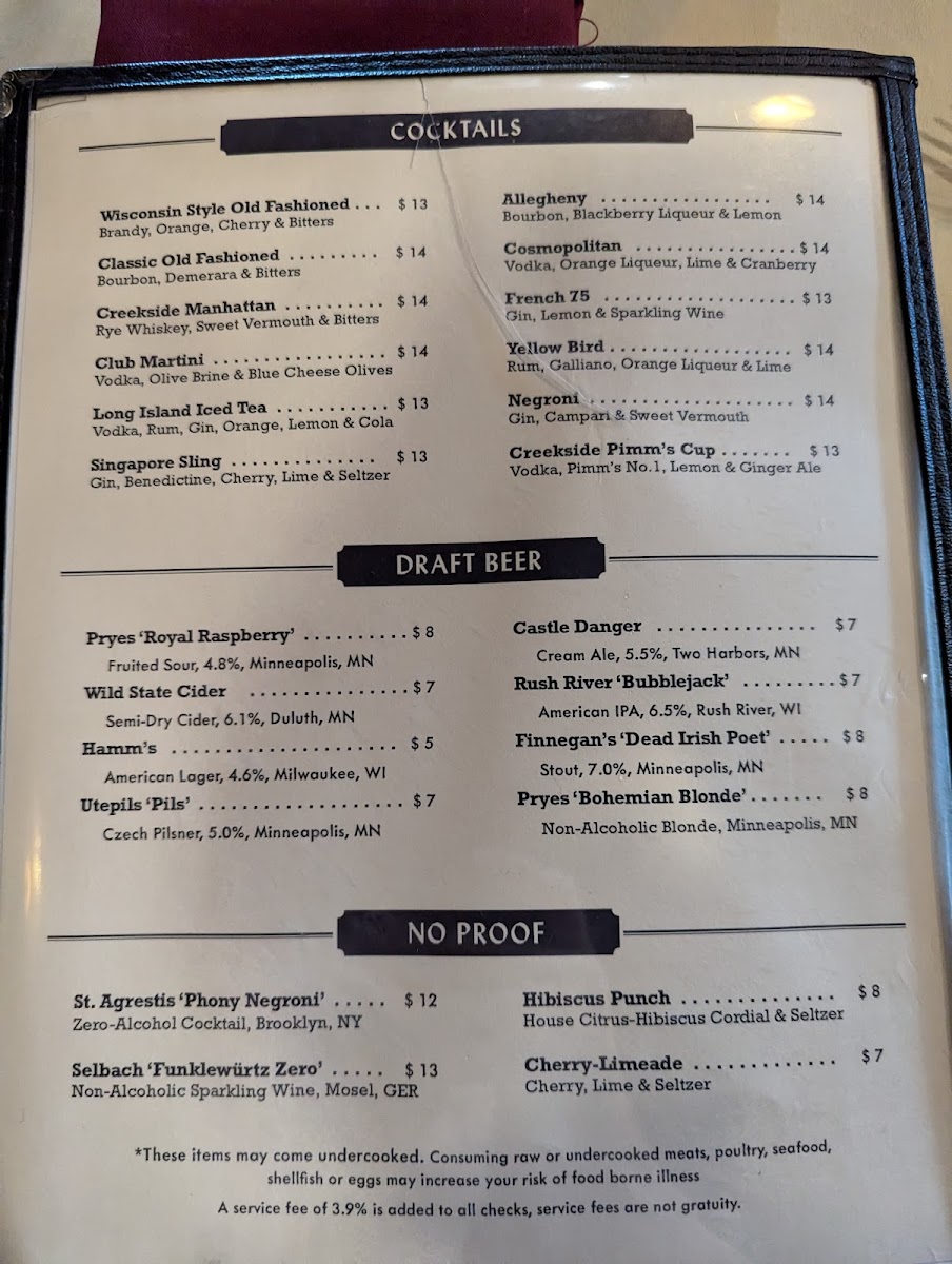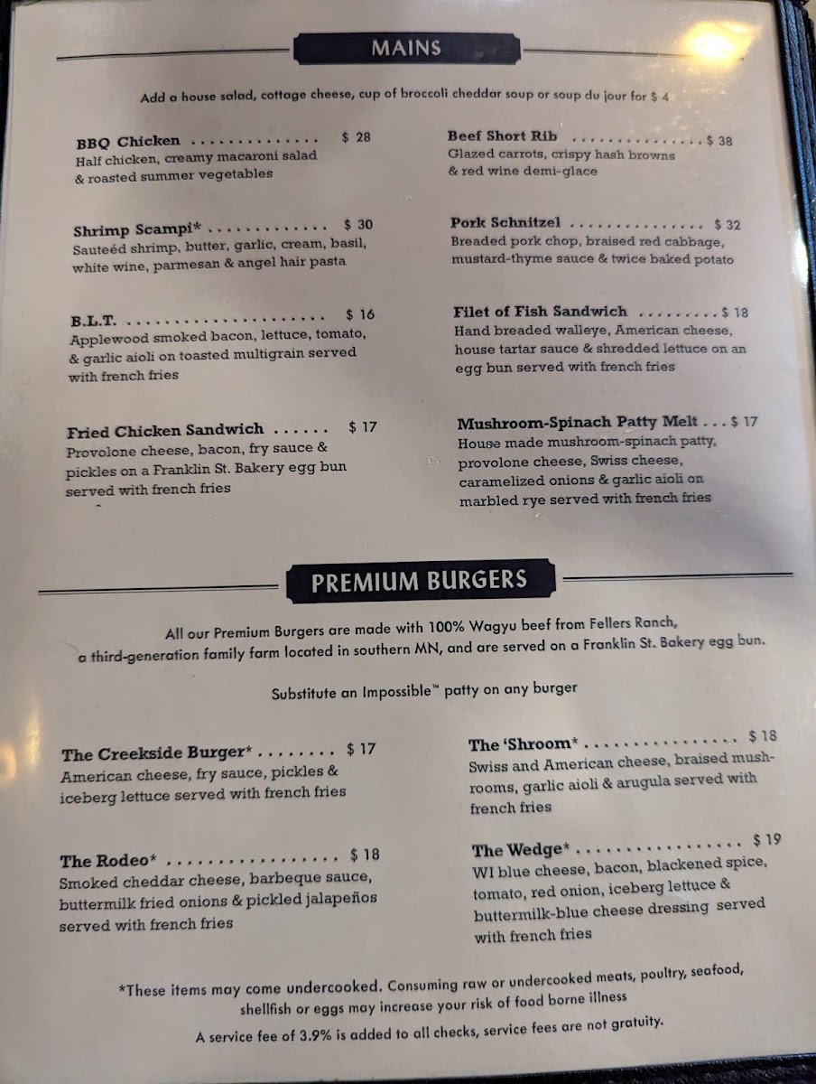 The Creekside Supper Club Menu brings together a delightful mix of flavors, perfect for anyone looking to enjoy a memorable meal in the heart of Minneapolis. Nestled at 4820 Chicago Ave, this cozy spot is known for its inviting atmosphere and a menu that boasts something for every taste. Whether you're in the mood for a hearty steak, a fresh salad, or a comforting seafood dish, you'll find a dish that hits the spot. The menu changes with the seasons, offering the freshest ingredients and exciting new options regularly. From casual bites to elegant entrees, there's always something to satisfy your cravings at The Creekside Supper Club. Be sure to check out the specials-they're a fan favorite and a great way to experience the chef's creative spin on classic dishes.